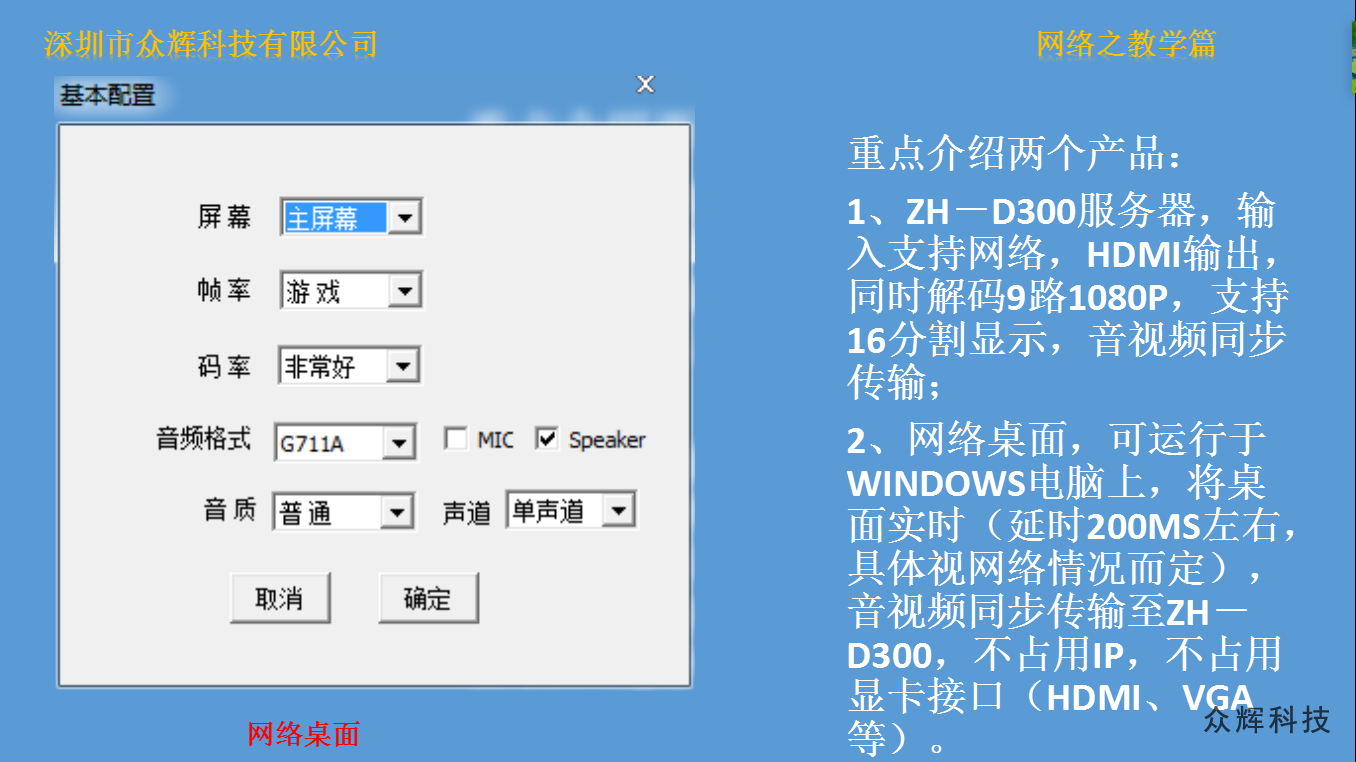 網(wǎng)絡(luò)桌面是我公司在WINDOWS系統(tǒng)上研發(fā)的一款電腦同屏軟件,只需要將電腦接入局域網(wǎng),即可完成音視頻同步在ZH-N3000(網(wǎng)絡(luò)拼接系列產(chǎn)品)、ZH-D300(網(wǎng)絡(luò)拼接處理器)ZH-N230(網(wǎng)絡(luò)版電視拼接處理器)等設(shè)備上,實現(xiàn)液晶拼接大屏同步顯示。